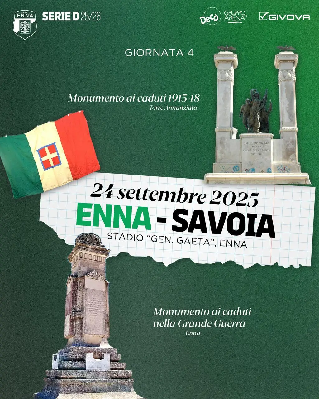 In occasione della partita di Serie D tra Enna e Savoia, vogliamo ricordare e onorare due importanti monumenti ai caduti che rappresentano la memoria storica e il sacrificio delle nostre comunità durante la Grande Guerra.